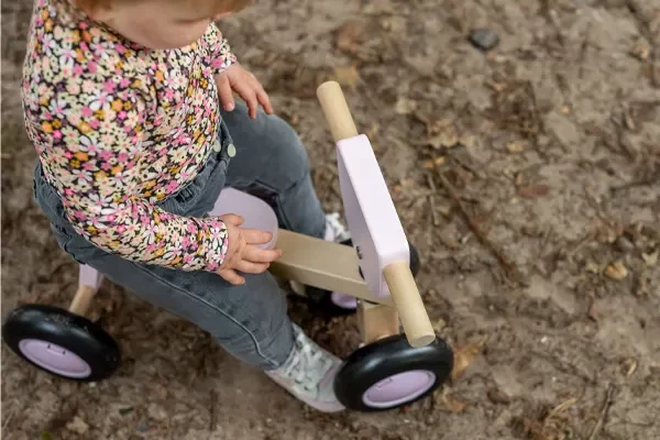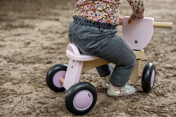 Een houten loopfiets voor kinderen vanaf 1 jaar. Het zadel heeft een vaste hoogte van 22 cm en het stuur is 34 cm hoog. Veiligheid is zeer belangrijk: het stuur heeft een begrenzer waardoor deze niet door kan klappen. En op de zitting zit een opzetstukje tegen het afglijden. De loopfiets staat stabiel op vier wielen. Deze zijn van een zacht kunststof, waardoor ze geluidsarm zijn en geen krassen maken. De Vintage Rider pink is een prachtige stabiele en duurzame loopfiets! Optioneel: een naamsticker op de voorzijde.