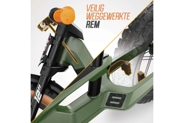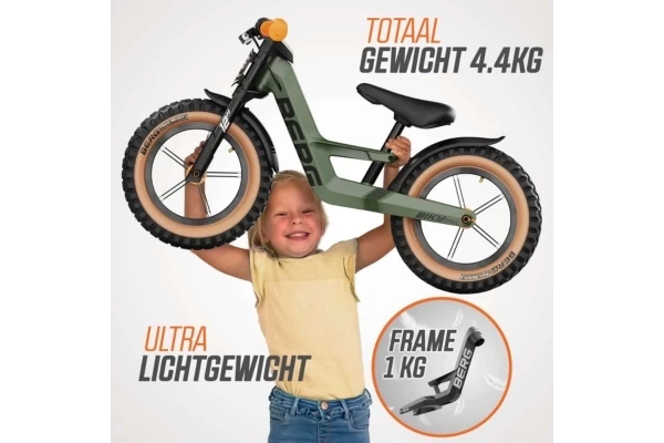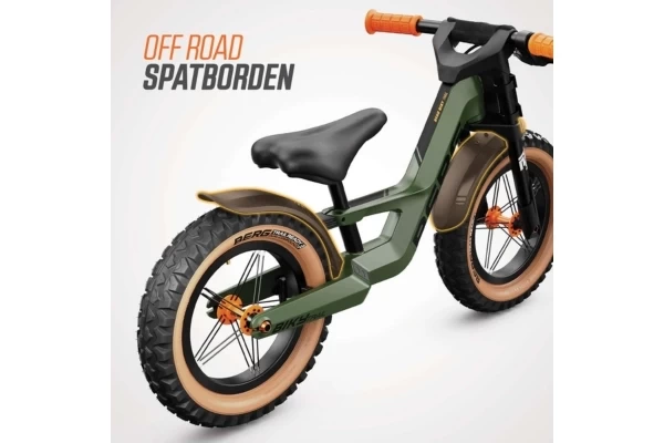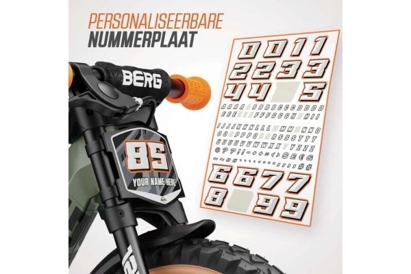 Een stoere magnesium loopfiets met een off-road design! Er zitten zwarte spatborden op en het nummerbord voorop kan gepersonaliseerd worden met het meegeleverde stickervel. De 12" wielen hebben skinwall banden. De Biky Trail heeft een stuuruitslagbegrenzer en een verstelbaar zadel (35-45 cm). Het magnesium frame heeft geïntegreerde antislip voetensteunen. Aan het stuur vind je oranje veiligheidshandvaten, een BERG kinbeschermer en een handrem.